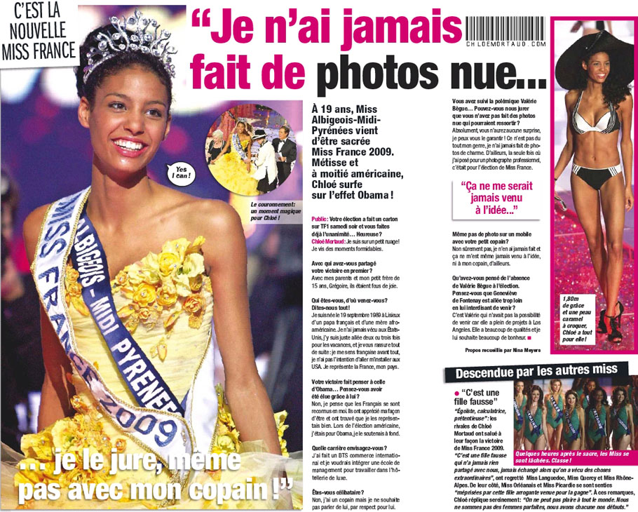 Interview de Chloé Mortaud, Miss France 2009, dans le magazine « Public » 283. Trop d’interviews en même temps tue l’interview car nous avons à chaque fois les mêmes questions et donc les mêmes réponses. A retenir donc cette fois çi la promesse de Miss France 2009 sur le fait qu’elle n’a jamais fait de photos nue amateur et professionnelle puisque la première fois qu’elle a posé devant un photographe pro c’est pour le concours Miss France.